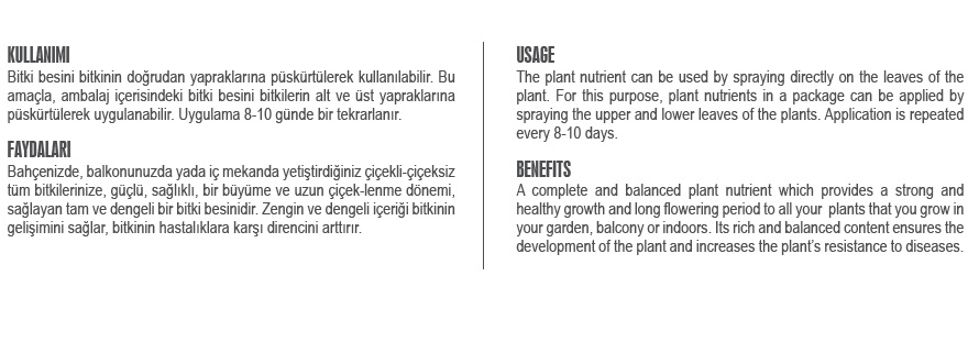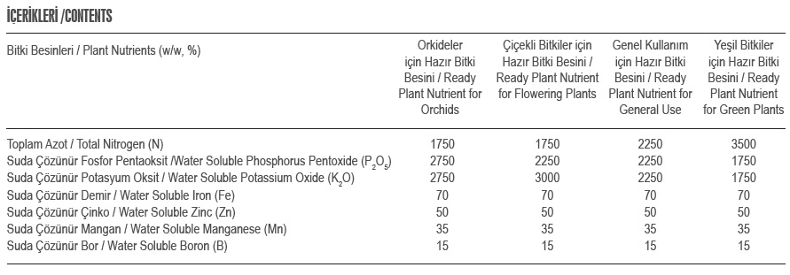 There are 4 types of products. These 1- Ready plant nutrient for green plants, 2- Ready plant nutrient for flowering plants, 3- Ready plant nutrient for general use, 4- Ready plant nutrient for orchids
